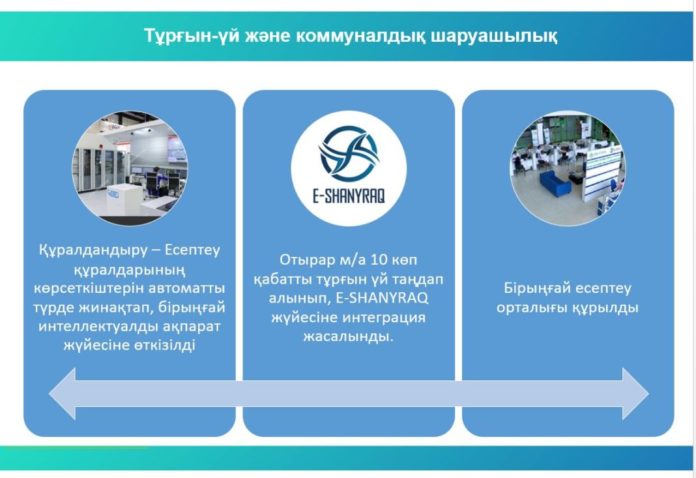 «В сфере энергетики и ЖКХ реализуется концепция «Smart сity». В частности, в десяти многоэтажных домах микрорайона Отырар города Туркестана проведена интеграционная система «E-SHANYRAQ». Она контролирует расход воды, тепла и электроэнергии. Жители домов могут посредством Интернета контролировать свои коммунальные расходы и платежи», — отметил он.