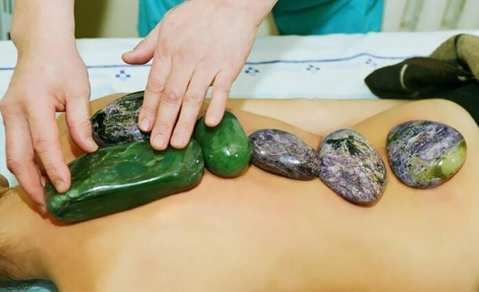 Слегка нагретый минерал прикладывают на больные места при ушибах или ревматизме в качестве длительно действующего согревающего средства. В восточной медицине массажные валики и шары из нефрита широко используют для массажа тела, для косметического массажа лица. Литотерапия (наука лечения камнями) уверяет, что бусы из зеленого нефрита снимают учащенное сердцебиение, нормализуют сон, успокаивают нервную систему. Небольшие нефритовые шарики используют для упражнений, развивающих кисти рук после инсульта и различных травм.