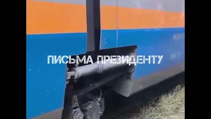 В социальных сетях появилась видеозапись, на которой очевидец показывает повреждения вагона и утверждает, что автомобиль протаранил пассажирский поезд «Алматы — Шымкент», передает OTYRAR.