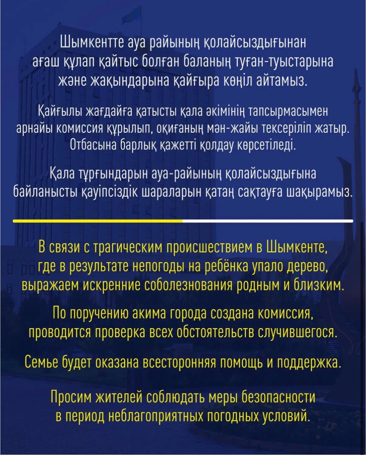 Акимат Шымкента выражает глубокие соболезнования семье ребёнка, погибшего во дворе многоэтажки из-за падения дерева в период неблагоприятных погодных условий, сообщает OTYRAR.
