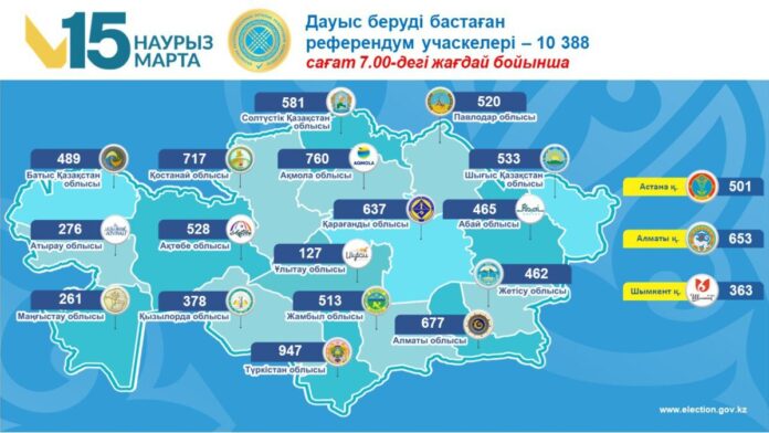 Как сообщили в центральной комиссии референдума Республики Казахстан, по стране подготовлен 10 401 участок для голосования.