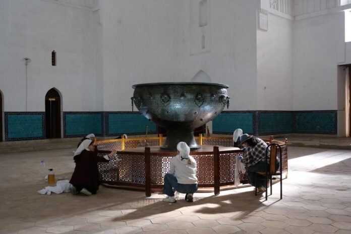 Внутри мавзолея Ходжи Ахмеда Ясави проведена генеральная уборка: помещения очищены от пыли, приведены в порядок полы. На участке от ворот Мүсәлла до мавзолея Рабии Султан Бегим, а также возле Восточной бани и подземной мечети Кылует очищены обочины, приведены в порядок прилегающие территории и выполнены покрасочные работы.