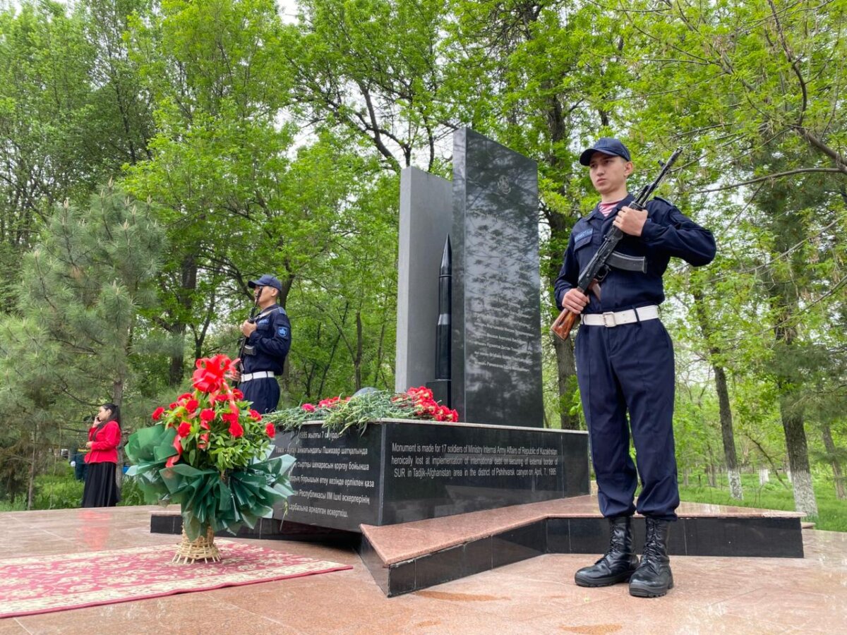 В парке Абая в Шымкенте прошёл митинг памяти, посвящённый 17 военнослужащим войск правопорядка, героически погибшим на таджикско-афганской границе 7 апреля 1995 года.