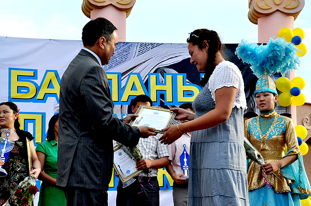 Аскар Мырзахметов награждает Лилю Шаймарданову в номинации «новшества в журналистике»